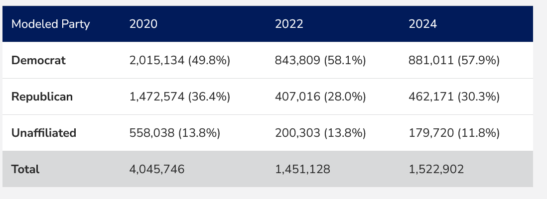 Here’s the latest 7 battleground state early vote tally (no GA yet) from TargetEarly. So far, so good peeps: