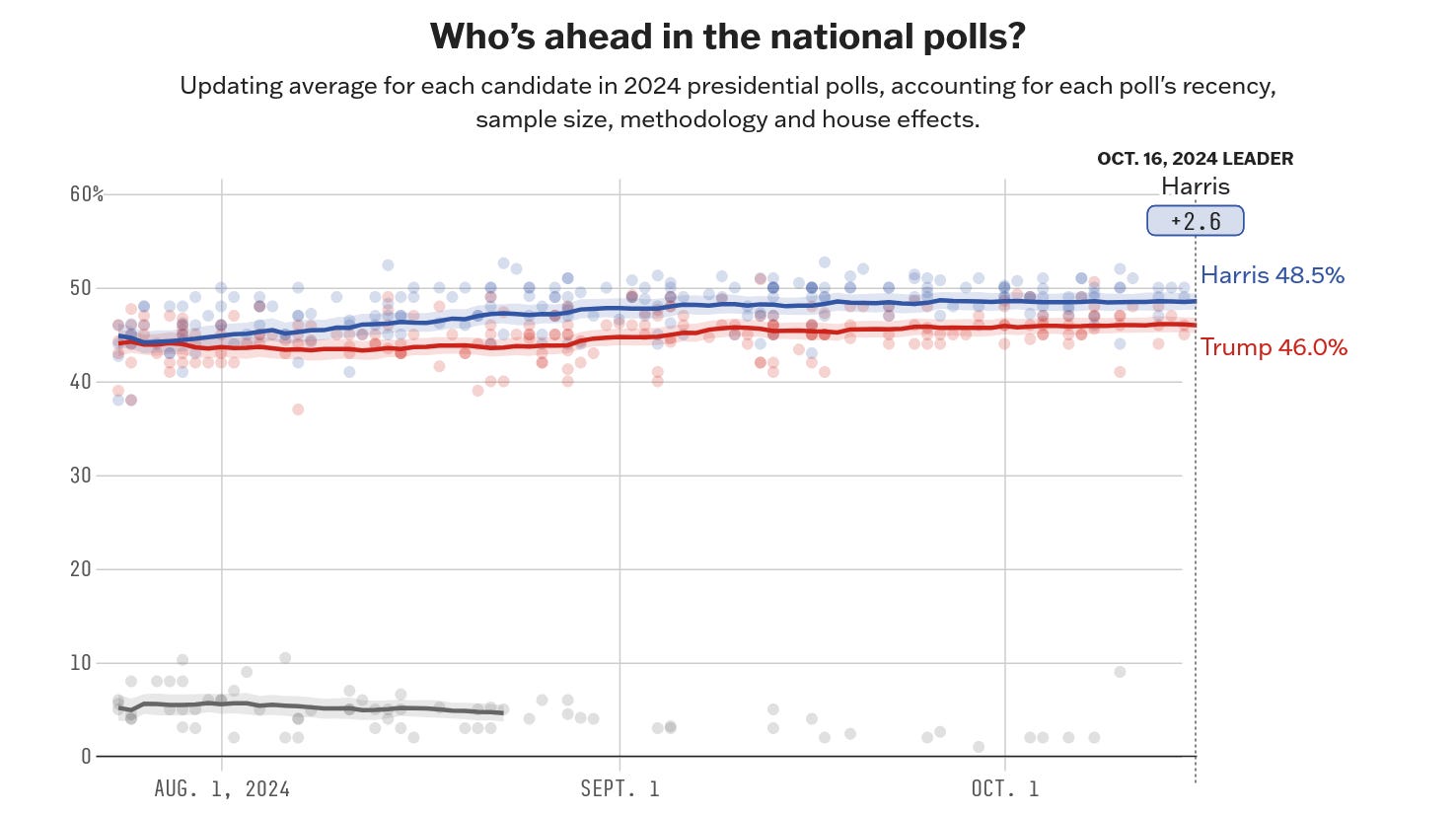 And here is the latest 538 national popular vote poll average. Harris is one tenth of a point higher than a week ago: