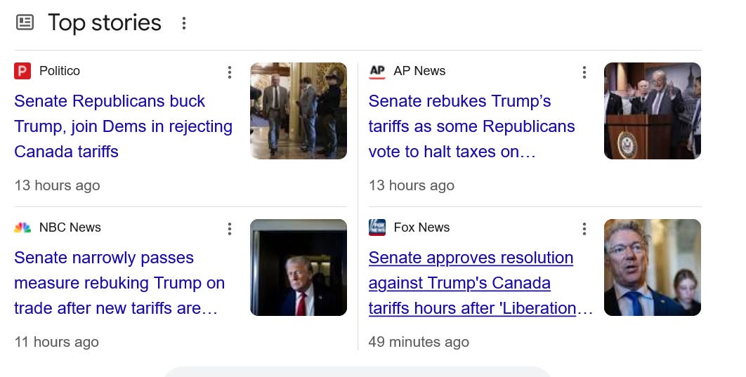 On Monday Cory Booker took to the Senate floor for the most powerful and public dissent we’ve seen from any member of either chamber so far. On Tuesday Trump front man Speaker Mike Johnson had 9 Republicans break from him and vote with Democrats to block their legislative agenda for the week. It was such a dramatic and unexpected loss for the Speaker that he spitefully sent the House home for the rest of the week. And then last night, just hours after his tariff announcement, four Senate Republicans - Collins, McConnell, Murkowski, Paul - voted with the Dems to PASS a Senator Kaine-led resolution that overrides Trump’s fake declaration of a national emergency that provides him the authority to impose onerous tariffs on Canada. It is rightfully being called a “rebuke” of our mad leader in the press this morning.