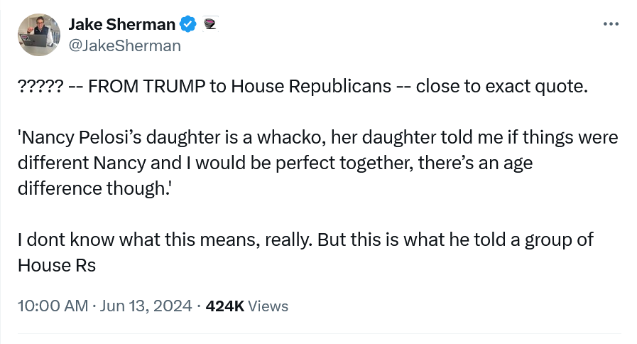 In a meeting with House Republicans this morning, this deeply terrible and unwell man - a rapist, fraudster, traitor, felon - fantasized out loud about getting together with Nancy Pelosi. Just OMG.