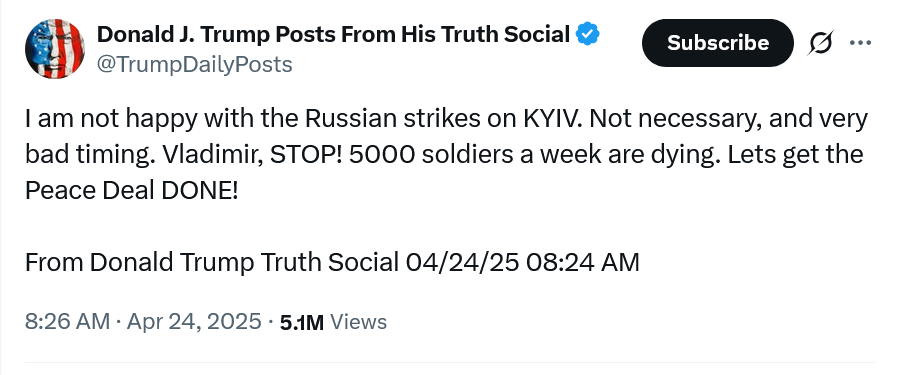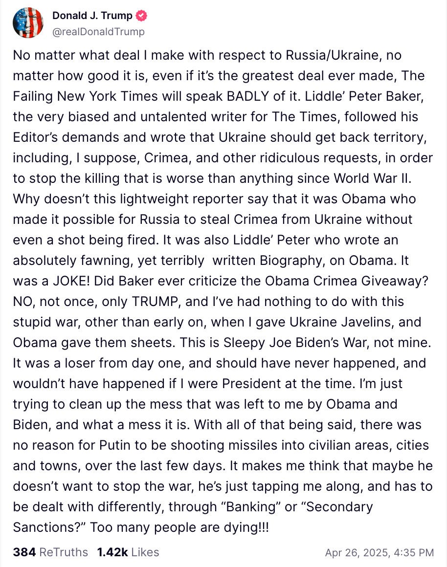 So here is the great Strongman, our own Orangey Wizard, admitting that perhaps he has gotten played by Putin? If he can wake from this dangerous fever dream are there others we can get him to wake from, like understanding that everything he has said about his tariffs is wrong? I still maintain that working to get rid of these tariffs is the most important thing we can be doing in the short term. They are wildly destructive and are doing clear and material harm to every American, Republican and Democrat. They are without question unconstitutional, as Trump is asserting powers in levying these tariffs he simply does not have nor could any leader of any democracy ever have.
