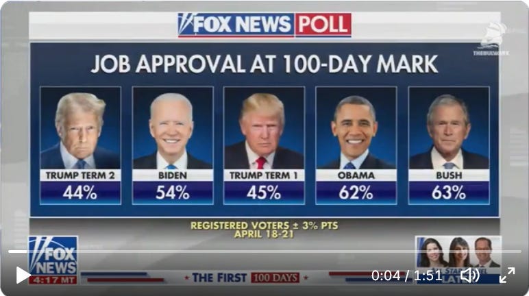 Morning all. Another extraordinary week. My big take away as we head into the weekend - this Trump thing isn’t working as they planned. The strong economy Trump inherited is turning to crap. The tariffs are an economic and political disaster. His poll numbers have cratered. We routed them in Wisconsin and keep overperforming in elections across the country. After ransacking the Capital and trashing Tesla Musk has left town. Hegseth is an ongoing, corrosive embarrassment. Putin and Xi are publicly mocking Trump and reveling in their good fortune that they got such a feckless idiot in the White House. Despite his crude intimidation tactics the circle of defiance is growing. The Courts and the states continue to provide a very, very powerful bulwark against his authoritarian fantasies. The country is recoiling at his cruel treatment of people, his new Gulag, his abandonment of due process and the Constitutional order.