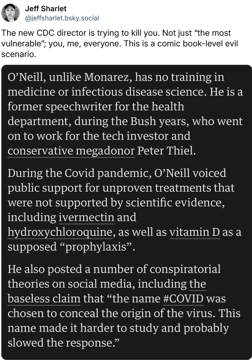 Pritzker’s health department in Illinois is currently exploring the possibility of purchasing Covid-19 vaccines in bulk straight from manufacturers in response to the mess in Washington, a senior Illinois health official confirms to me. Meanwhile, a coalition of mostly-blue states led by Massachusetts Governor Maura Healey is planning to coordinate on the purchase and distribution of pediatric vaccines, should the federal government restrict access to them, according to a source familiar with ongoing discussions. This will likely include big states like New York and Pennsylvania.