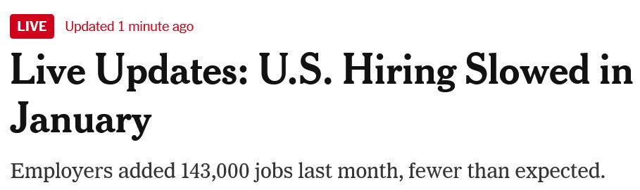 Morning all. We got the monthly jobs report this morning and it was one of the worst since COVID - 143,000 jobs were added last month. Here is how the NYT played it: