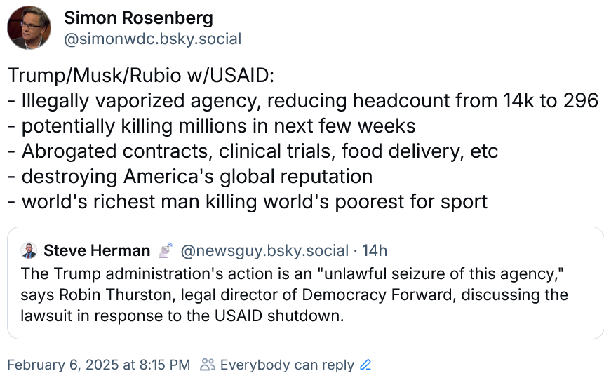 Let’s dive into another manifestation of the more for me, less for you approach - the world-altering assault on USAID and our programs for the poorest people in the world. I share a CNN story (video above) about how Senator Marco Rubio was for many years one of the most powerful defenders of USAID in Congress. In 2022 Rubio even asked President Biden to INCREASE USAID’s budget. Secretary of State Rubio - yes, this same guy - is now overseeing the Musk-initiated illegal vaporization of the agency. Do watch, above. It’s stunning stuff.