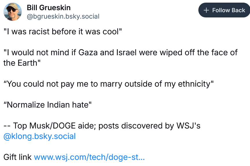 Marko Elez is no longer with Musk. He resigned yesterday after the Wall Street Journal found a slew of old wildly racist postings of his. So be clear - the 25 year old who rewrote the code in the Treasury payment systems is now out there for foreign intelligence agencies and other malicious actors to have their way with. Yes, this is where we are, and why we need to keep fighting…..
