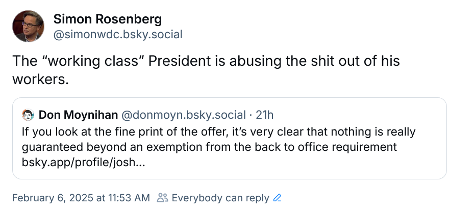 In fact, what we are seeing now is probably the worst treatment of workers by an employer - Donald Trump - that America has seen in a hundred years, perhaps ever. He is breaking laws to fire people; offering fake buyouts; abandoning American citizens working abroad; forcing people to the office with very planning. Donald Trump, our “working class” President, has launched an unprecedented and illegal reign of terror against hundreds of thousands of working Americans all in the service of more for me, less for you. He is a betrayer of working class Americans, not a champion.