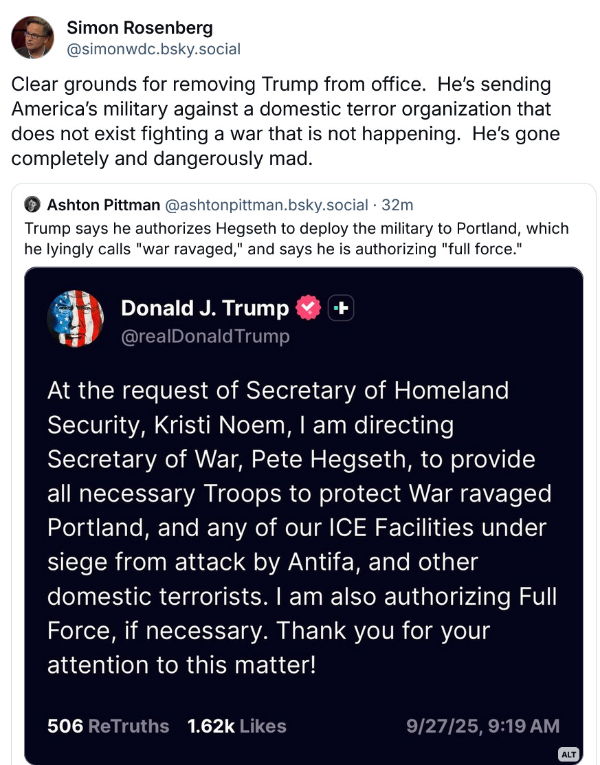 Morning all. The government will shut down Tuesday night. There is no Republican budget, there are no negotiations happening - nor have there been any negotiations - as Rs have told Dems to shove it and Trump is having a big golfing weekend. Again the reason the government is going to shut down this week is that the Trump and the Republican majority have failed to produce and pass a fiscal year 2026 budget that they are required by law to pass by September 30th. So the government is just going to run out of money. It’s mindboggling levels of recklessness and dysfunction, though perhaps on brand for this terrible era of Trump.