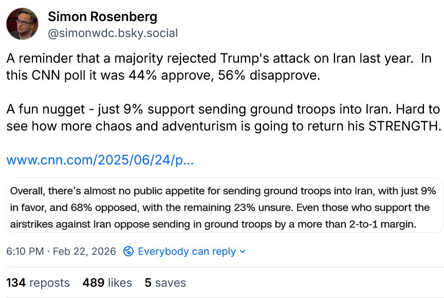 To prep for the State of the Union we have new podcasts/discussions about Trump’s selling out the West to Putin; the urgent need to rein in ICE; fighting MAGA’s assault on science; what comes next - nothing good - now that the Supreme Court has taken away his imaginary Mad King/taxation without representation tariff powers, and an encouraging report from battleground Iowa.