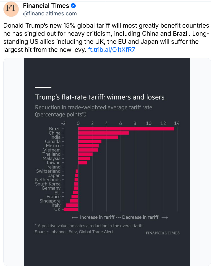 Because he is an impulsive, desperate idiot, his new tariffs (also illegal, and temporary) are punishing those who negotiated trade deals with him and rewarding those he tried to punish: