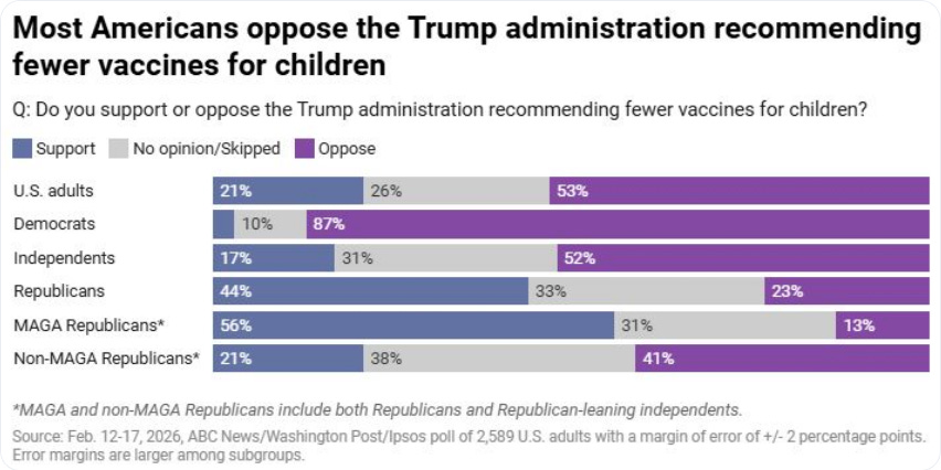 Only 21% of Americans are on board with his assault on vaccines (see our anti-science discussion yesterday for more on this):