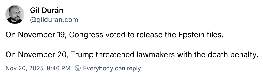 “Despite signing the Epstein Files Transparency Act, it’s crystal clear that Donald Trump and Pam Bondi may use language in the law to slow or stop release of the files by launching a new bogus Epstein investigation. The Oversight Committee subpoena does not allow the Administration to hold back the Epstein files for any reason. Oversight Democrats will continue to apply pressure and make it clear there is no justification for any cover up,” said Ranking Member Robert Garcia.