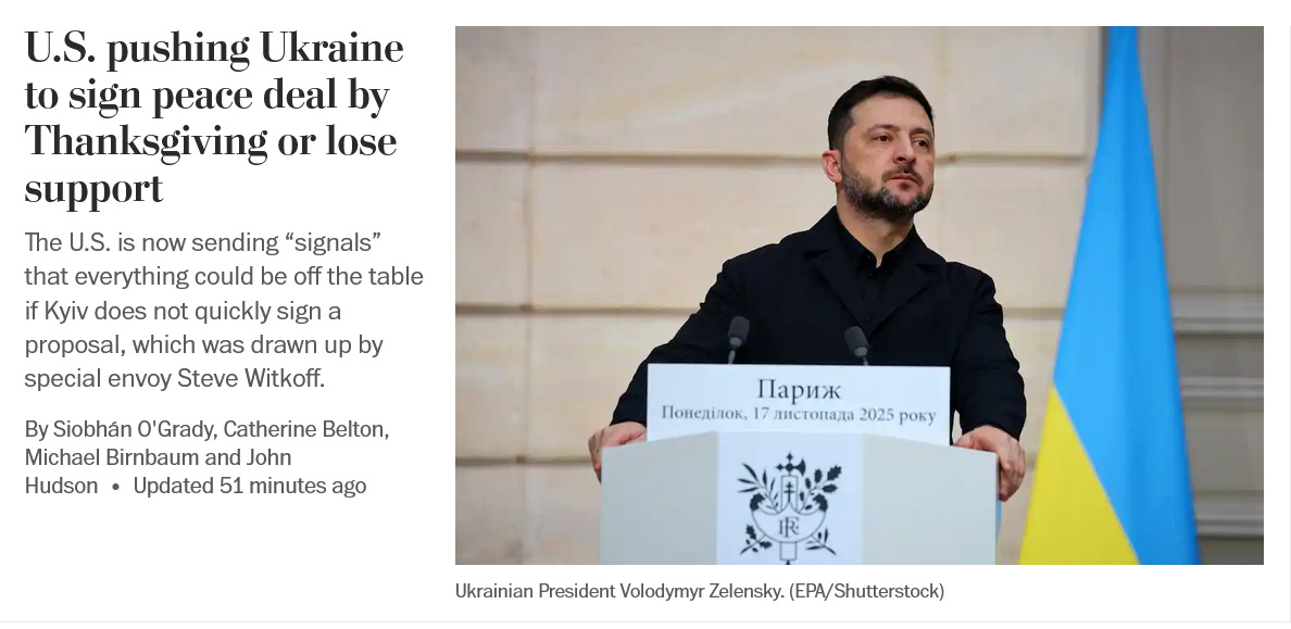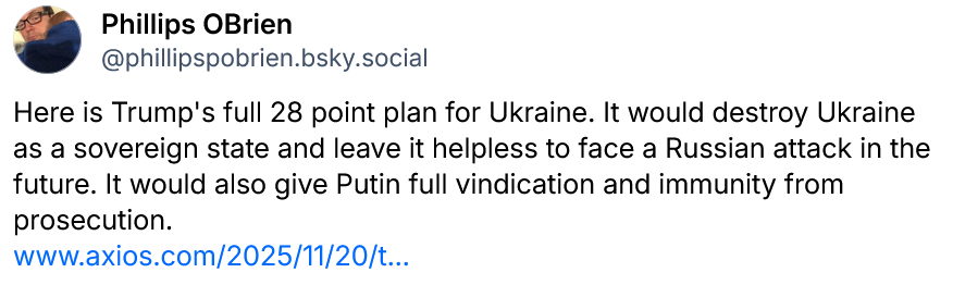 Republicans are waking up to how bad this really all is; how it is likely to get worse, much more worse; and how hard - if not impossible - it will be to run with Trump in 2026. For Trump is the worst President in our history. He has done enormous harm to the country. He is cartoonishly corrupt and lawless. The Epstein scandal is shaping up to be the most consequential in our history. He tore down the East Wing of the White House to build himself a gilded ballroom for fuck’s sake. I am sure talk of jettisoning him will grow. But as the stories of his selling out of Ukraine, his threats to hang lawmakers, and illegally invade another country also tell us he is not just a lame duck, a failure, and a fuck up, he is also desperate and dangerous, an out of control sundowning madman of the world’s most powerful nation.