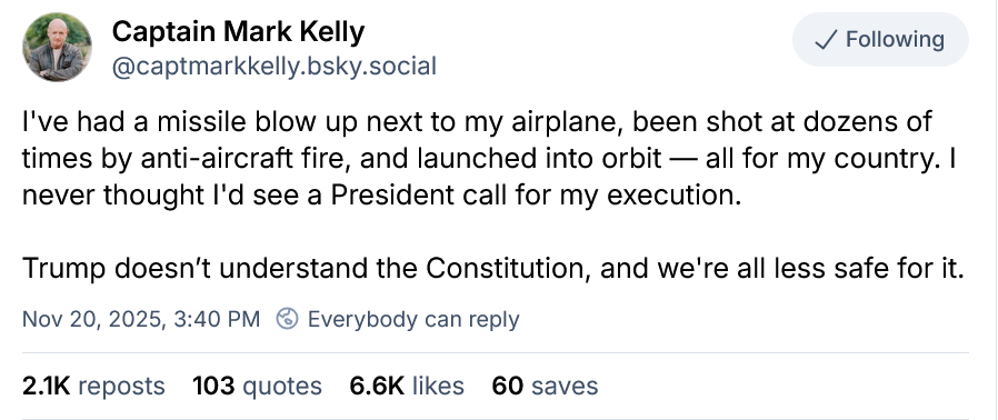 Here’s the video from Senators Kelly and Slotkin, and House Members Crow, Deluzio, Goodlander and Houlihan, that reminded service members that it was their duty to refuse to follow illegal orders: