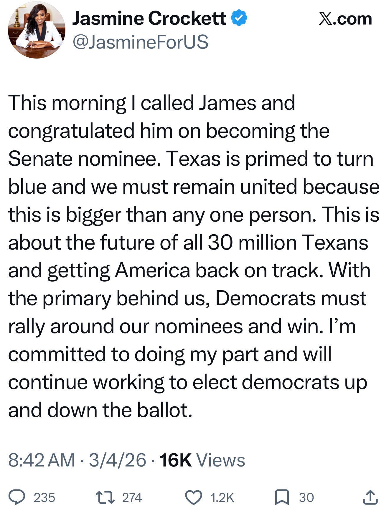 Since published this morning Jasmine Crockett, a remarkable and inspiring leader, formally conceded to James Talarico. Unlike the clown show Republicans, Texas Democrats are united heading into the general election. All hail Rep. Crockett for her grace and commitment to the mission. Onward!