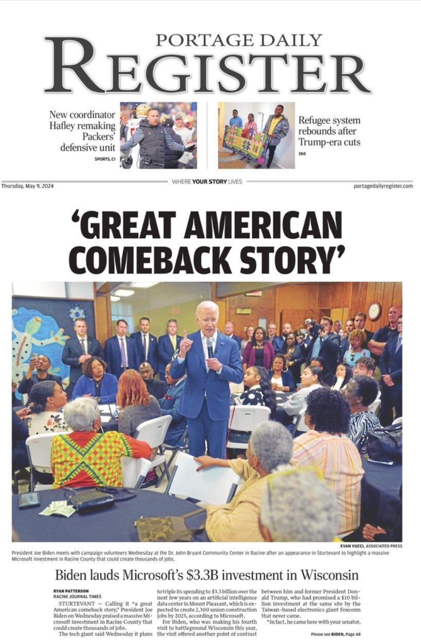 In Racine, Wisconsin, President Joe Biden announced that Microsoft is investing $3.3 billion dollars to build a new data center that will help operate one of the most powerful artificial intelligence systems in the world. It is expected to create 2,300 union construction jobs and employ 2,000 permanent workers.