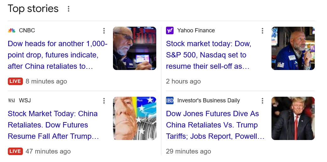 China retaliated this morning putting 34% tariffs on all imported American goods, a dramatic though expected escalation of Trump’s trade war. Asian markets are off again this morning, and our stock markets are steadying for what will be another very bad day.