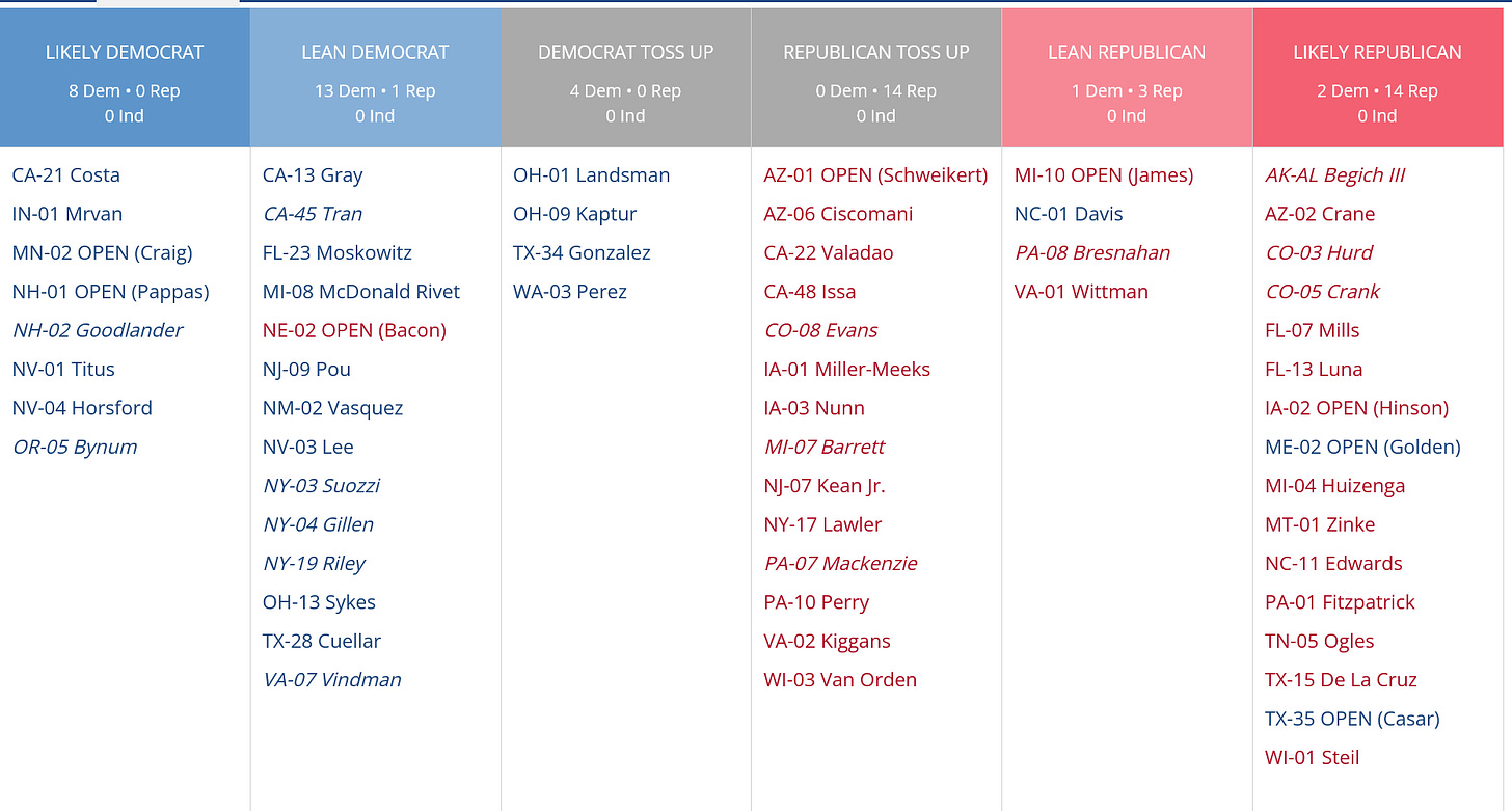 Note that all 7 of our Hopium House 7 - those newly elected Members from battleground districts who we helped elect in 2024 and have been supporting again this time - are no longer in toss up, and are all “Lean Democrat” or better. Congratulations everyone. This was always the goal - win these tough battleground races, and then make sure they get re-elected. We are on track to do that now. Thanks to everyone who has contributed to these critical House races - remarkably we are almost at $3m raised for battleground House races in just the last two years. What can we do together this year peeps?
