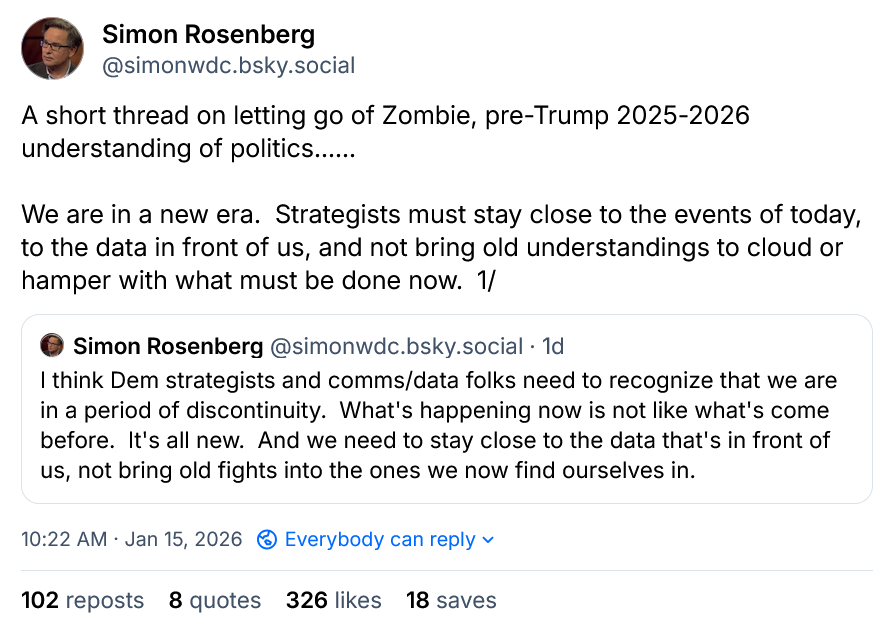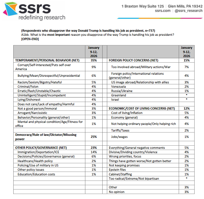 This poll, like every other poll released this week, shows the public turning against ICE and Trump’s lawless assault on Minnesota. Here’s my recap of some of that data from earlier this week, a link to my conversation with Greg Sargent where we dive into the data and the politics of Stephen Miller/ICE, a link to my weekly talk where I discuss the terrible events and courageous citizens in Minnesota and The Great Task Remaining Before Us.