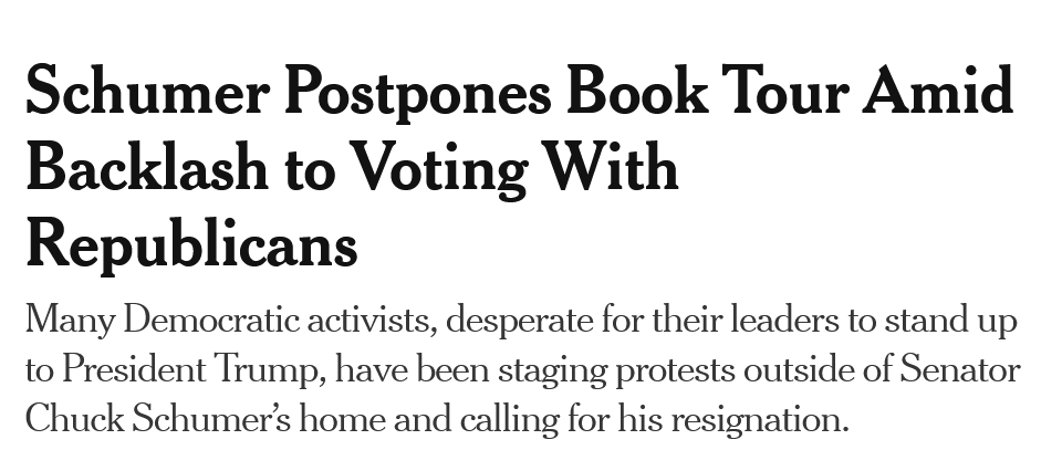 Canceling his book tour is a sign that Senator Schumer is waking up to what is required of him now in a time of unprecedented challenge to our Constitutional order and America itself. It is a welcome development. Let us hope that he uses the free time he now has this week to develop a far more aggressive battle plan to prevent Mad Donald from becoming a true American Mad King.