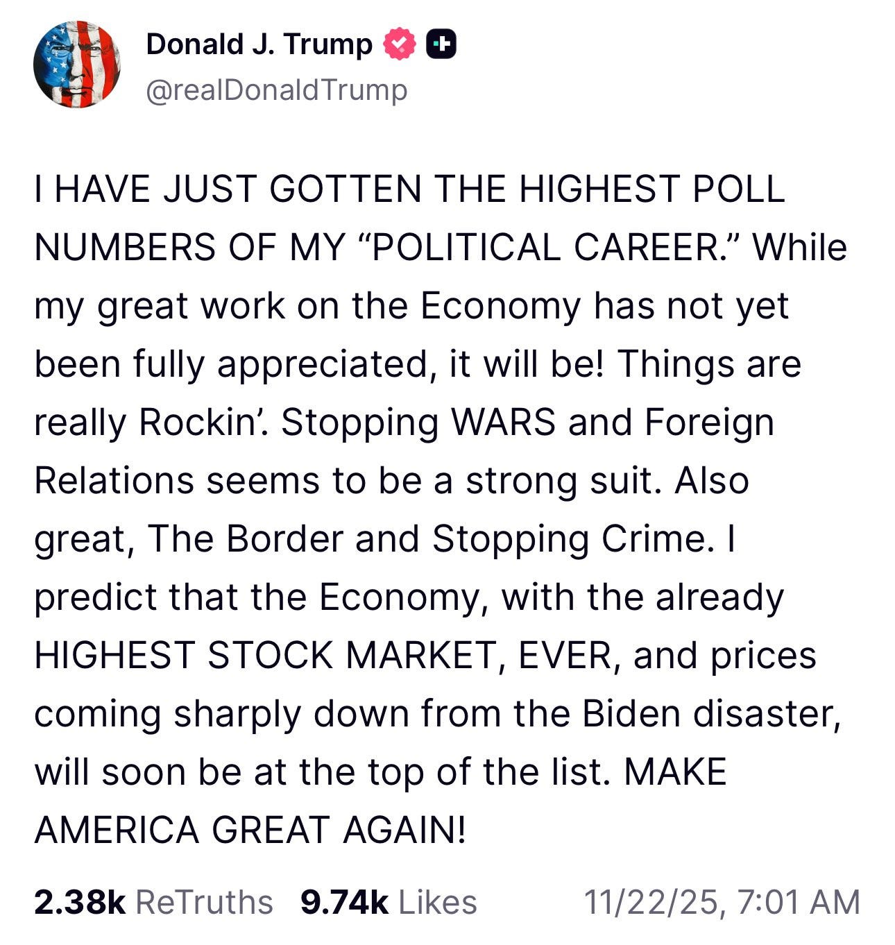 As I wrote yesterday I think the Capital is waking up to what a disaster Trump has been for the country; how unpopular he is; how corrupt and venal; how old, ailing and just delusional and bat-shit crazy he is. It is just too much. He has gone too far. The ridiculous scenes with Mamdani yesterday confirm how erratic and unhinged he has become. As do posts like this from this morning. It is just not clear that he understands what is happening around him any longer, and Congress must step in and start taking the keys away from him:
