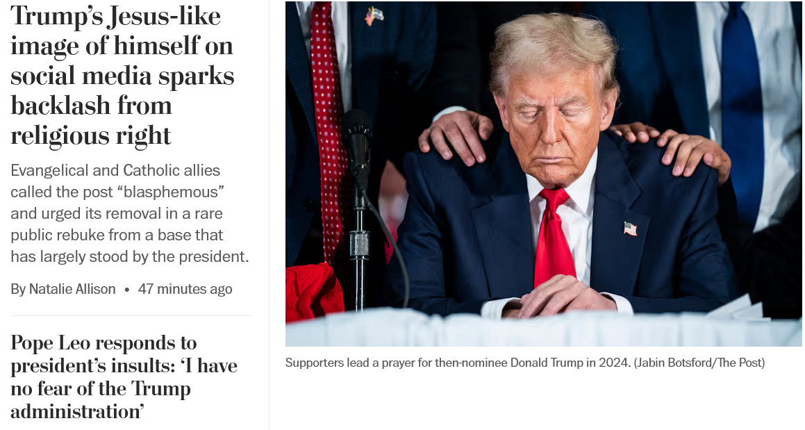 If the image of Trump as Christ helps to educate the Christian leadership that his role is neither Christian nor leadership, so be it. But that image must be removed ASAP. And America stands with Pope Leo. Meanwhile, are there really NO GOP Senators or Congresspeople who will stand up to this leader and limit the escalation of this war?!!! This must be our #1 message today.