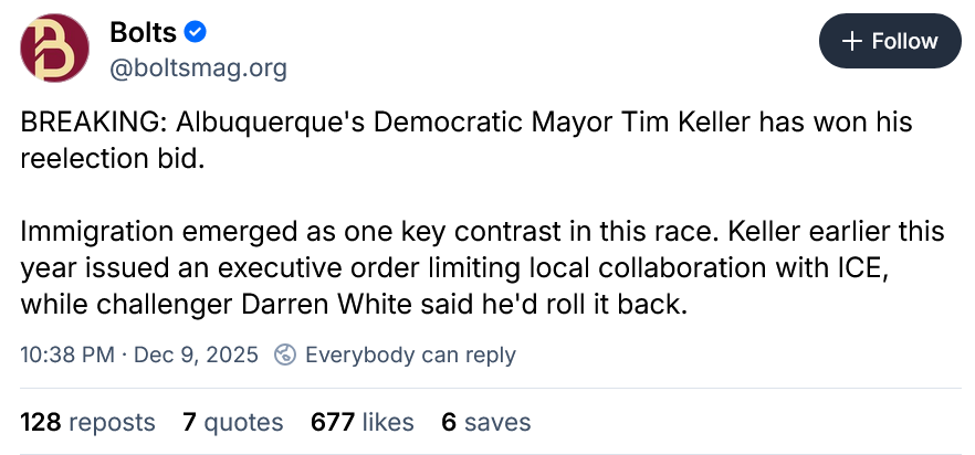 It also needs to be said that we continue to see not only shifts in the battlefield, and something that feels like an early blue wave, but our margins of victory - in contested races with Republicans spending money - continue to be just jawdropping, stuff you just don’t see. In November we won statewide races in AK, CA, GA, ME by more than 20 points. Sherrill and Spanberger won by 13 and 15 points. Eileen Higgins, in a seat not held by Dems in almost 30 years, won by 19 points. Mayor Keller won by 16.