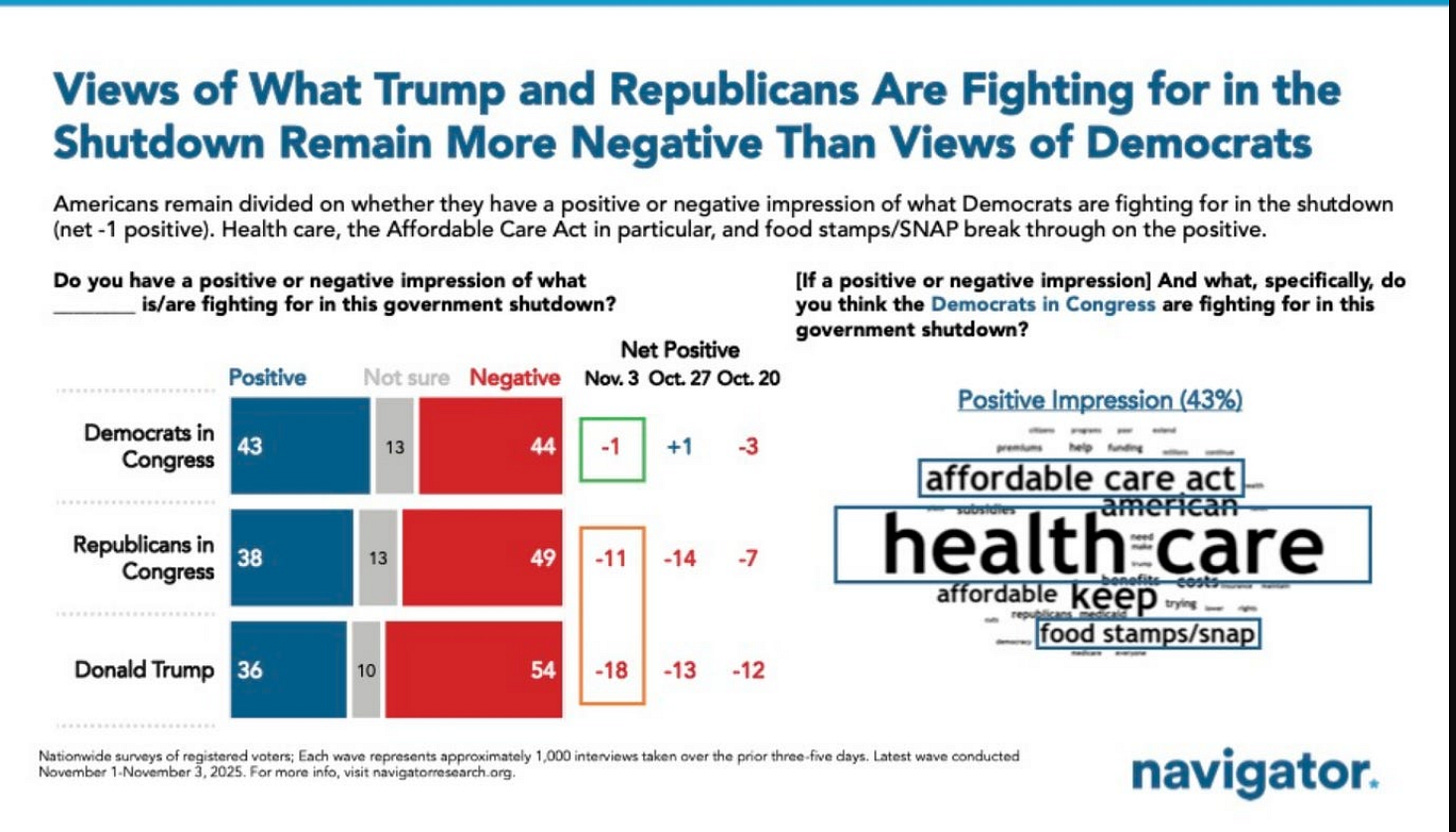 Despite The Clear Repudiation Tuesday, Trump Decides To Keep Harming The American People - Looking back there can be little question that the shutdown played a major role in our big wins on Tuesday, something Trump himself had said this week. I think it did so in two ways: 1) these last few weeks have shown the Democrats unified and fighting for the American people 2) it has reinforced our current indictment of him - his malevolence, his desire to be a king, his “more for me, less for all you” strategy. As I’ve shown you in the data Trump and Republicans have not just weakened in recent weeks, our party has become stronger relative to them in many measures (Party ID, generic ballot, who’s best on the economy).