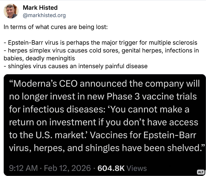 As a result of this attack on their mRNA technology - the tech that saved us from COVID - Moderna announced the halting of late stage trials into three incredibly promising vaccines: