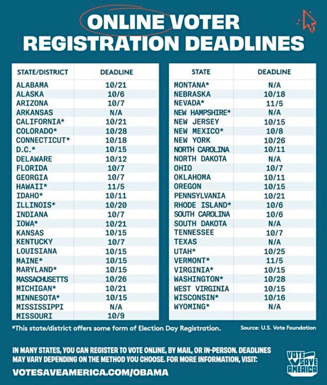I want to spend some time this morning talking about how the election is about to change, and in ways that should be good for us. With early in-person voting starting this week the election is going to start entering a new and vital phase. The act of people voting is going to start making the election far more real to people at a time when we have an advantage. It’s why the work we do - the calls, the postcards, the texting, the door knocking and info warring - matters so much now. Our friend Tom Bonier has been writing about the surge we are seeing in voter registration. Look at the voter reg deadlines, below. We have at least another month of voter reg left in most states, and at least 3 weeks in all states. With Taylor Swift and our family already working it, the onset of voting itself is likely to intensify the pace of registrations. If we keep working hard, keep being noisy about the importance of registering and voting we could easily gain hundreds of thousands of new voters in the coming weeks.