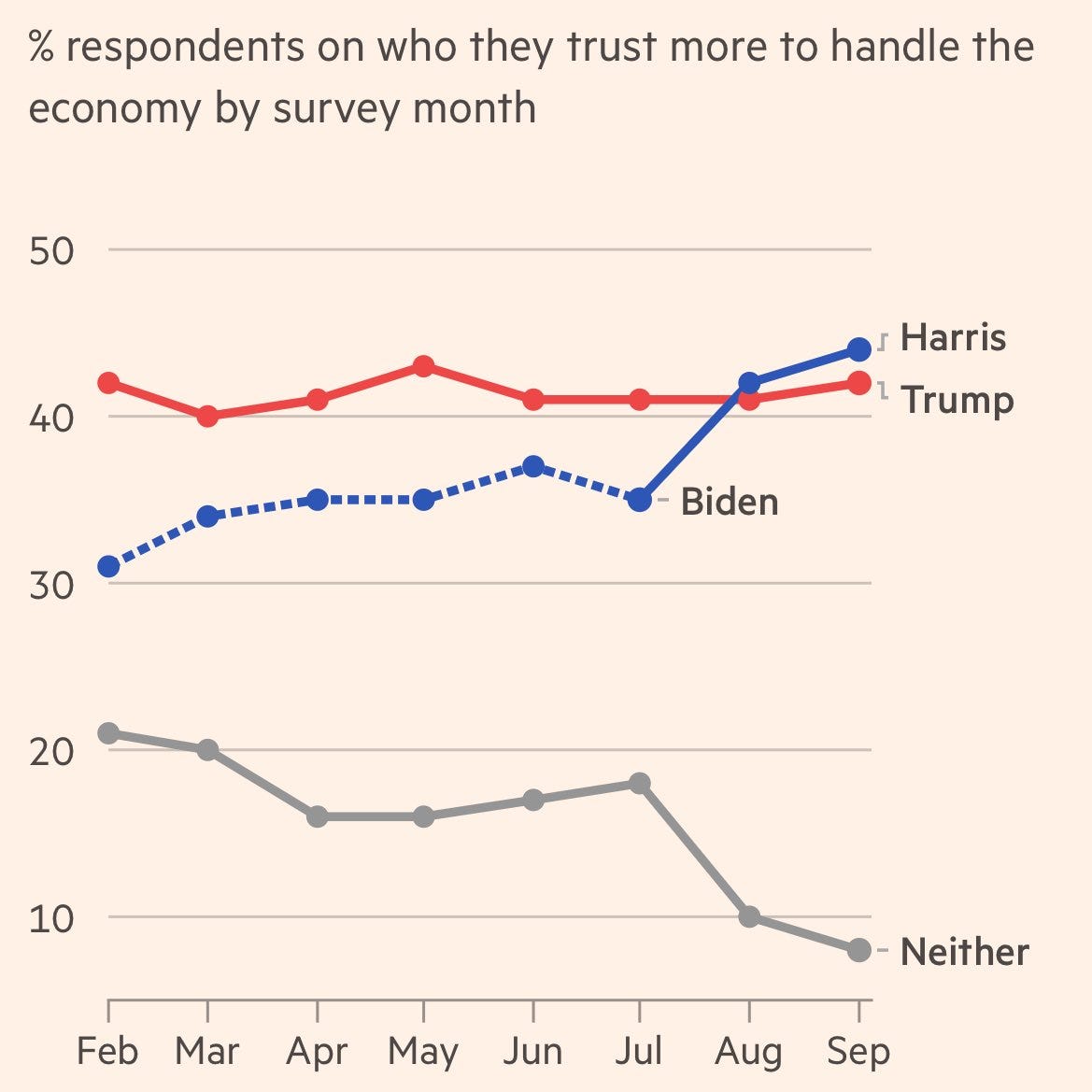 Happy Monday all. This weekend we got three more encouraging polls. ABC News found the VP leading by 6 among likely voters, 52% to 46%. The respected Des Moines Register poll in Iowa poll found Harris only down 4, 47%-43%, in what has been a very red state. In its last poll from June Trump led by 18 points. The Financial Times found the Vice President now ahead of the other guy on the economy. This is a big deal (this graph has been updated since the original post this am):