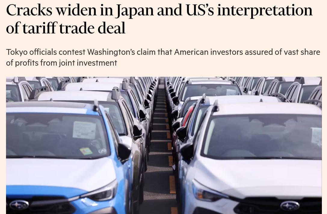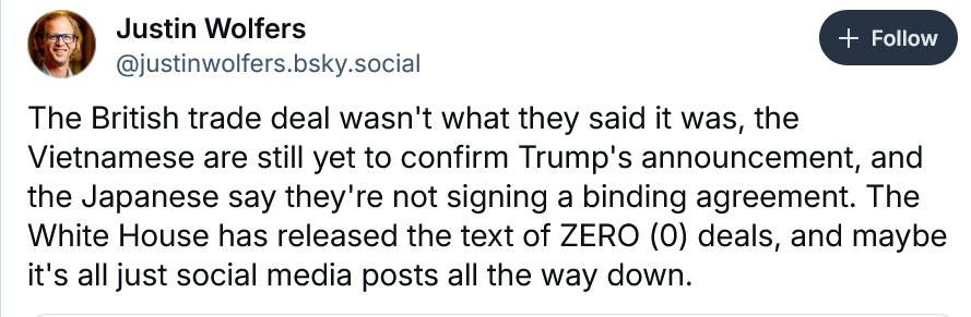 To understand what an incredible, desperate fiasco Trump’s impulsive decision to raise the tariffs two weeks has become we’ve now learned that there isn’t actually a trade “deal” with Japan, and Japan has publicly challenged Trump’s interpretation of what they agreed to. Here’s the FT yesterday (paywall, sorry):