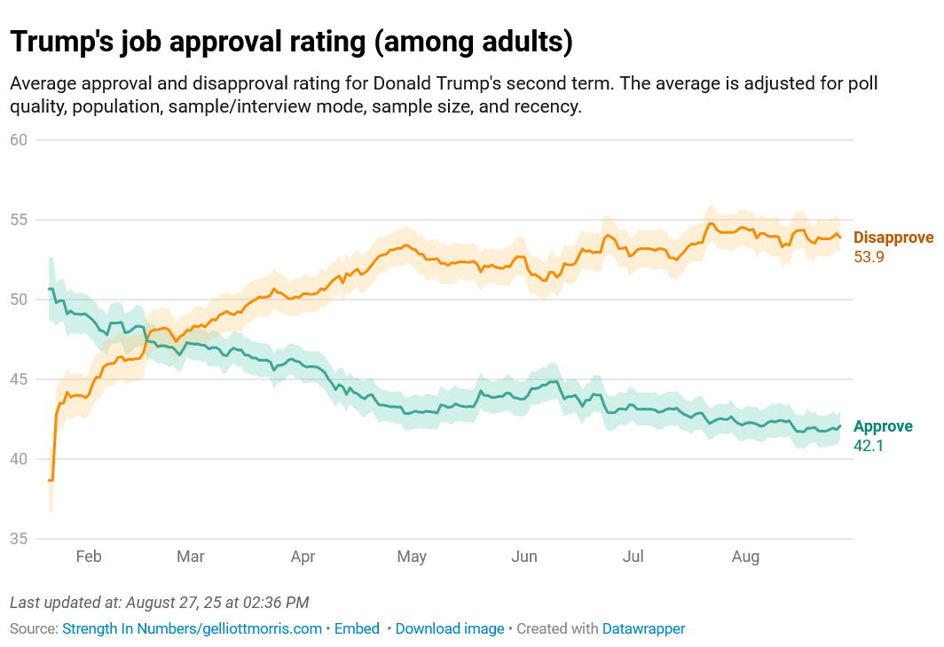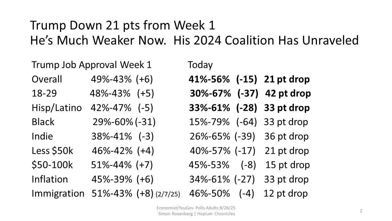 As we often say here two things can be true at the same time - 1) Trump is doing enormous harm to the country; is breaking things that will be difficult if not impossible to repair; and he has escalated and become far more dangerous in August 2) “Trump” the brand is in significant decline, and losing its hold on the public and the power to persuade; Democrats keep overperforming in elections and we should be viewing the fall and 2026 elections as ones of opportunity and expansion. In 2018, 2020, 2022 and 2023 we seized the opportunity the ugliness of MAGA presented us. We failed to do it in 2024. In 2025 and 2026 we must lift ourselves up and once again seize the opportunity that is clearly in front of us now.