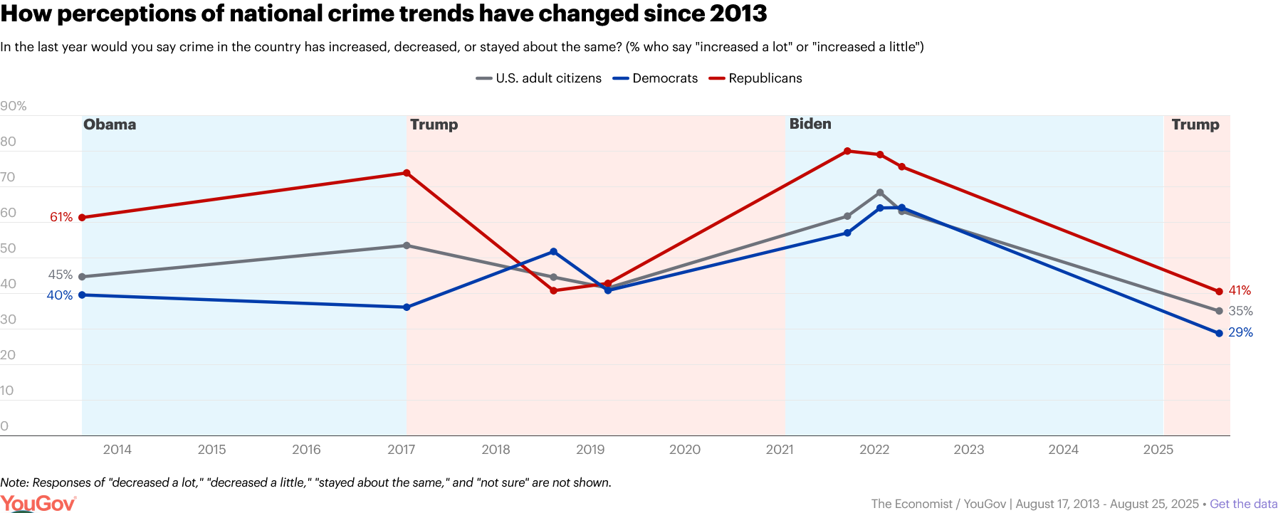 Economist/YouGov has a rash of interesting data this week on the DC occupation and crime. First, on the question of whether crime is a rising area of concern for voters we are at the lowest level of voters saying crime has increased in the last 12 years (this is consistent with actual crime statistics):