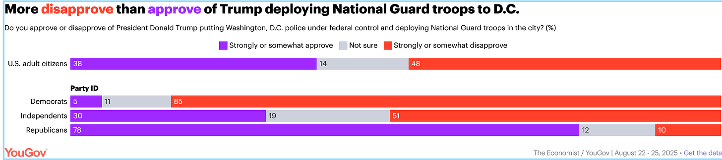 And like Quinnipiac Trump is underwater on the deployment of the National Guard to DC with independents coming in at -21. Pictures of National Guard troops picking up garbage in recent days isn’t going to help with these numbers.