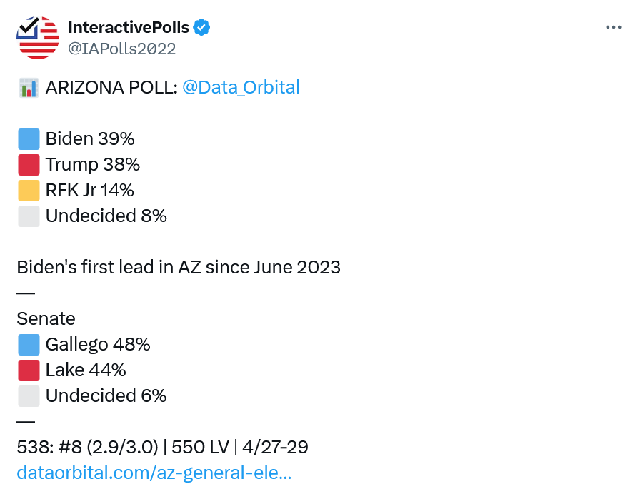 Good New Arizona Poll, Trump’s GOP Primary Struggles Continue, More on 2024 - A new poll by a conservative, highly-rated, conservative Arizona-based pollster Data Orbital has Biden up 1 and Gallego up 4. It is the first time Biden has led in an Arizona poll since June, 2023.