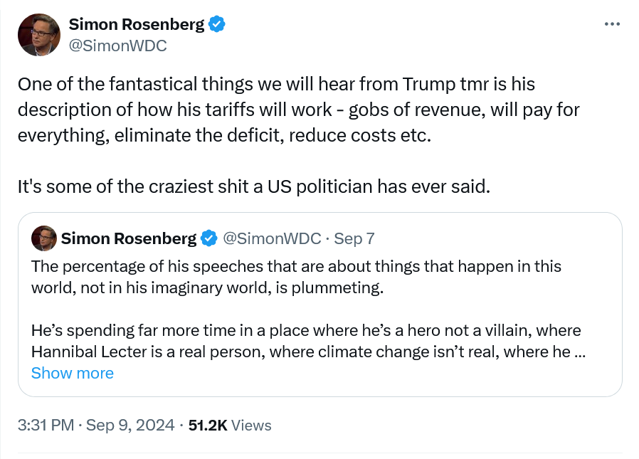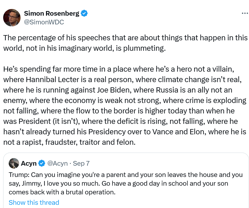 One thing I am thinking a lot about today is what I discuss below. The Vice President has to debate someone tonight who is unwell, untethered and who is far less frequently living in the same world we all do. We know she can handle Trump the rapist, fraudster, traitor, felon. Trump the extremist, bigot, xenophobe, misogynist. How she handles Trump the malevolent madman - who makes things up and is consistently trying to invent a new party and new party to run against because he cannot beat the one in front of him - is something that I’ll be watching closely tonight. For as someone who logged thousands of appearances on Fox News over almost two decades, I can tell you that when the crazy stuff comes out left field it sometimes can be jarring, for there are moments where you literally have no idea what they are talking about. I want to be clear that what Trump does is far more than lying - it’s invention, fabulism, madness - and that stuff ain’t easy to debate in a setting like tonight. We are not in a court room tonight. We will be spending time with Mad King Donald and that is never a good place to be.