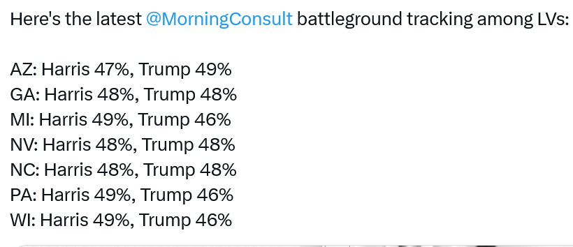 Five new polls released today also show a national popular vote consistent with this battleground data. Harris has a 4 pt lead among likely voters (LVs) in a new Big Village poll, a 3 pt lead among LVs in new NPR/Marist and Morning Consult polls, a 3 pt lead among registered voters (RVs) in new a 19th News/Survey Monkey poll and and a 2.4 pt lead in a new ActiVote poll (which has been running very Republican this cycle). A new VA poll has Harris up by 8, 51-43, and new battleground state polls by Redfield & Wilton have very similar data to the Morning Consult tracks (this passage has been updated since posting this morning. All polls can be found on 538)