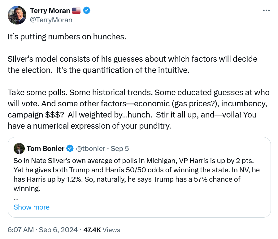 Some of you have asked about Nate Silver’s data showing Trump favored. Here is what one of his former ABC News colleagues had to say about that: