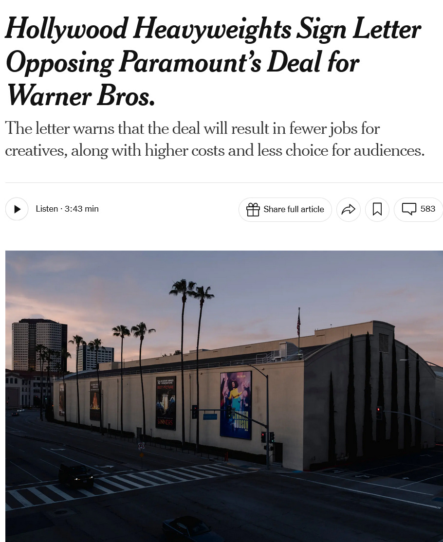 Here’s the NYT article Norm references about a new Hollywood coalition he’s helped build to fight the Paramount purchase of Warner Brothers.