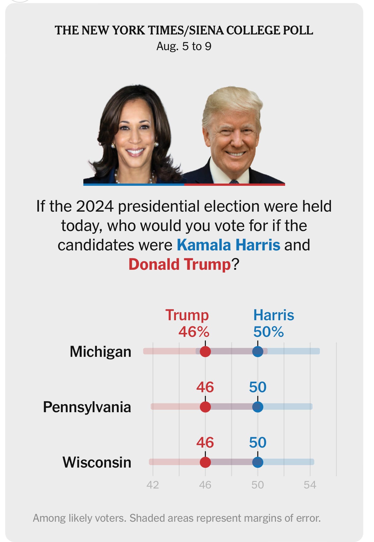 New New York Times polls have Vice President Harris leading 50-46 in Michigan, Pennsylvania and Wisconsin: