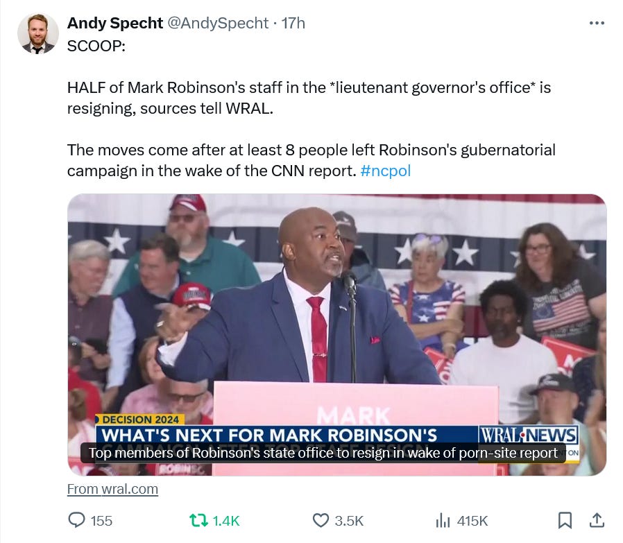 I discussed some of the new, encouraging trends I’m seeing in yesterday’s post. A new Washington Post poll has Angela Alsobrooks up 51-40 (+11) over Larry Hogan with likely Maryland voters. The ongoing Republican nightmare in North Carolina continues: