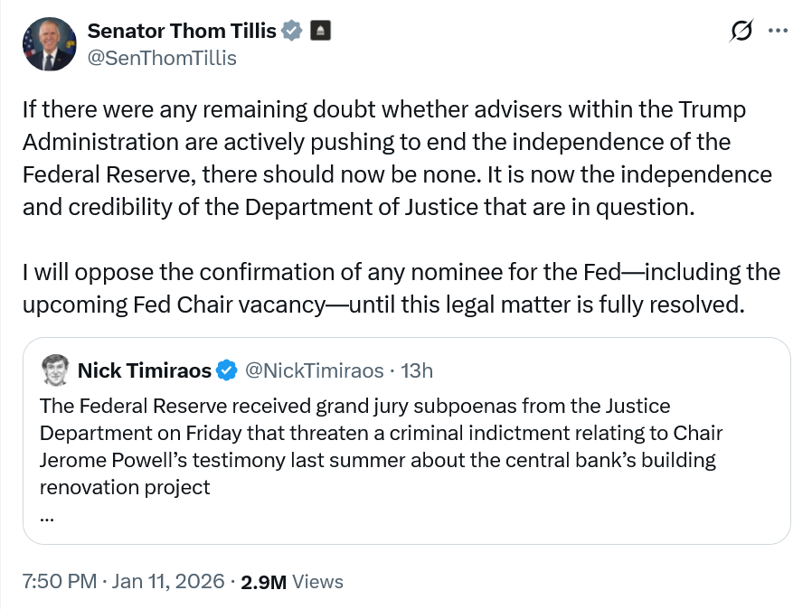 What happens this week on the Hill? Just in the last few manic days Trump has launched a full out assault on the Fed (see Chairman Powell’s historic video, below). He is threatening to invade Greenland, bomb Iran, struck targets in Syria this weekend, and last night declared himself “Acting President of Venezuela.” He is now fighting with the oil companies over their reluctance to become part of his Venezuelan oil fantasy; threatened the credit card companies with a law that only exists in his mind; sanctioned the killing of Americans by his paramilitaries for dissent; threatened to veto the resumption of the ACA subsidies if passed by the Senate; and with another anemic jobs report on Friday received further confirmation of the failure of his tariffs to deliver for the country, or Republican candidates facing extinction over affordability. The lunatic HHS Secretary is returning America to a pre-modern health era, threatening the lives and health of tens of millions of Americans. Millions of people took to the streets this weekend, many in terrible weather. We are now more than a quarter of the way into the new federal fiscal year without a budget, and the government may run out of money again in 18 days.