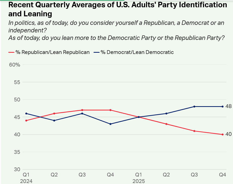 Some new Gallup data confirms that 2026 can be a year of opportunity for us. It finds that Party ID has shifted 12 points towards us from a year ago; from 43%-47% to 48%-40% today:
