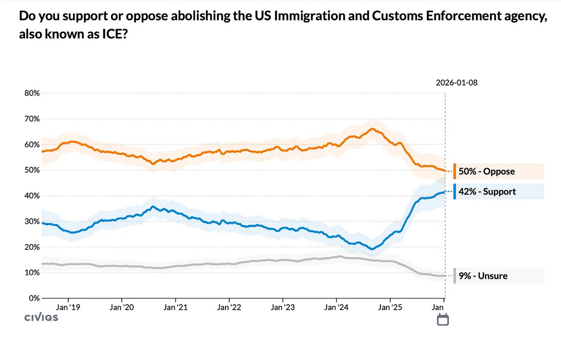G. Elliott Morris has a terrific new analysis looking at the public’s perception of ICE, Support for abolishing ICE hits a new high. It contains this eye-popping graph from Civiqs: