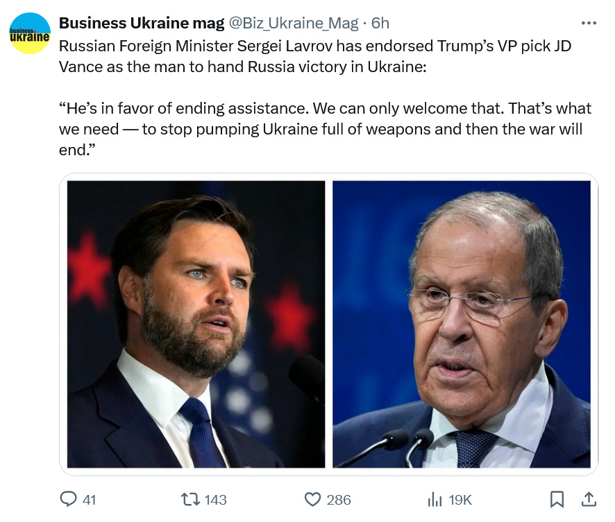 Here’s the Russian Foreign Minister applauding the madman’s choice of JD Vance: