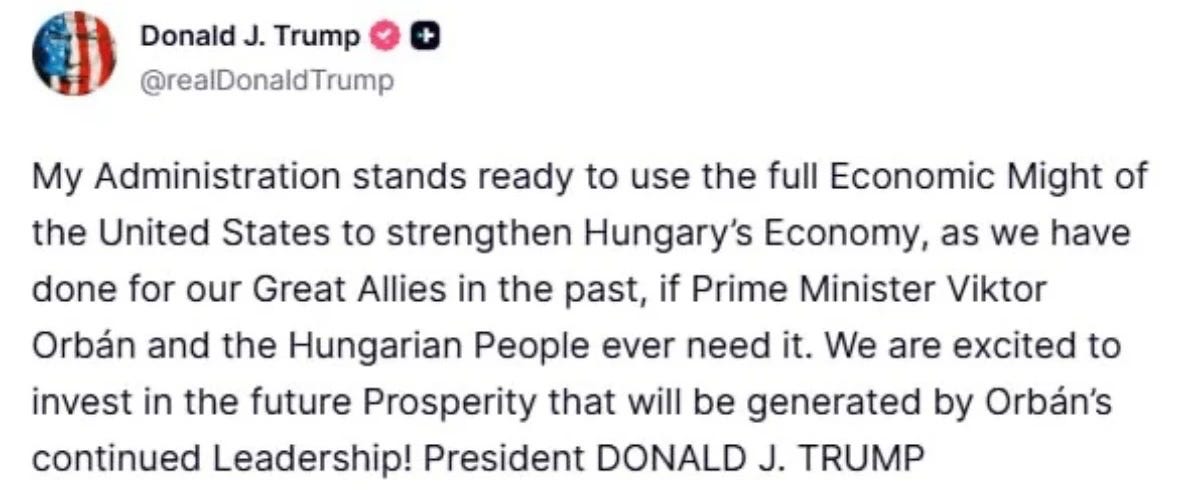 HUNGARY: Apropos that poll by of Hungarian voters by McLaughlin & Associates (by coincidence one of Trump’s favorite pollsters), which claims Orbán’s Fidesz party is 5.3 points ahead of Péter Magyar’s opposition Tisza party…