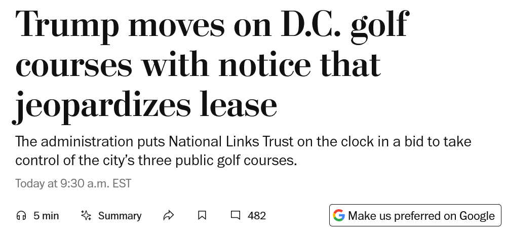 The Trump administration issued a notice of default to the group that manages Washington’s three municipal golf courses, escalating a behind-the-scenes struggle over who will control some of the District’s most visible public land and effectively positioning the president to operate its public golf properties.