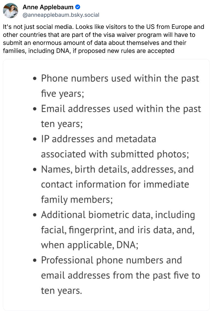 We also learned this week that the regime is working to implement Orwellian (or perhaps Palantirian) requirements to enter America for all potential visitors, including from our European allies: