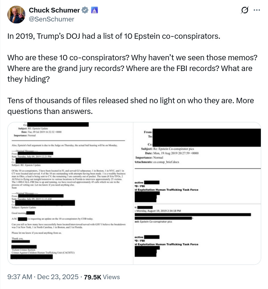 The Epstein files release clearly has the old, sundowning orange guy rattled. As it should for among the things we learned this week is that in 2019, while Trump was President and Bill Barr Attorney General (remember Barr’s father once hired Jeffrey Epstein), the DOJ had begun moving on 10 Epstein “co-conspirators” after his arrest. And then, nothing……